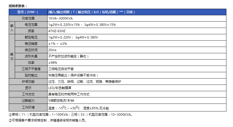 ZHW系列无触点感应式交流稳压电源是一款采用DSP控制电磁开关矩阵的泛用型、高性能稳压电源。本系列稳压电源通过改变补偿变压器主回路与补偿回路电磁耦合的大小,控制稳压电源输出端的电压,其具备优异的过载能力,适配于冲击性强、且频繁的感性负载,能承受启动时瞬间5倍大电流,该功率范围涵盖1~3000KVA。